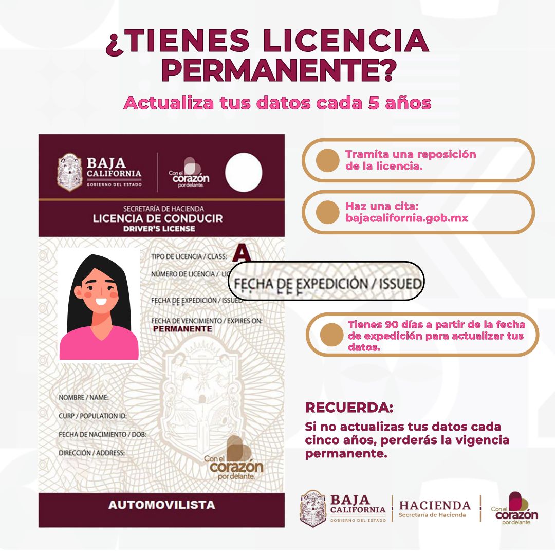 La Secretaría de Hacienda de Baja California precisa que la licencia permanente se debe renovar cada 5 años y si no se cumple el pago en el período especificado anteriormente, la licencia perderá su calidad de permanente.