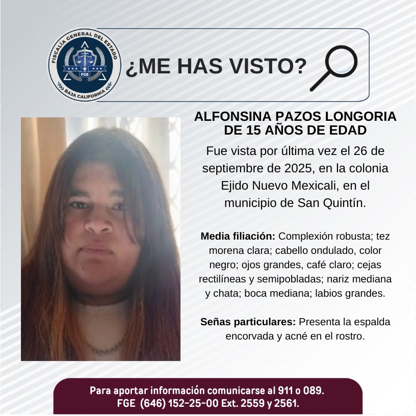 SAN QUINTÍN, Baja California, 29 de septiembre del 2025.- La Fiscalía General del Estado solicita la colaboración de la ciudadanía para la localización de Alfonsina Pazos Longoria de 15 años de edad.