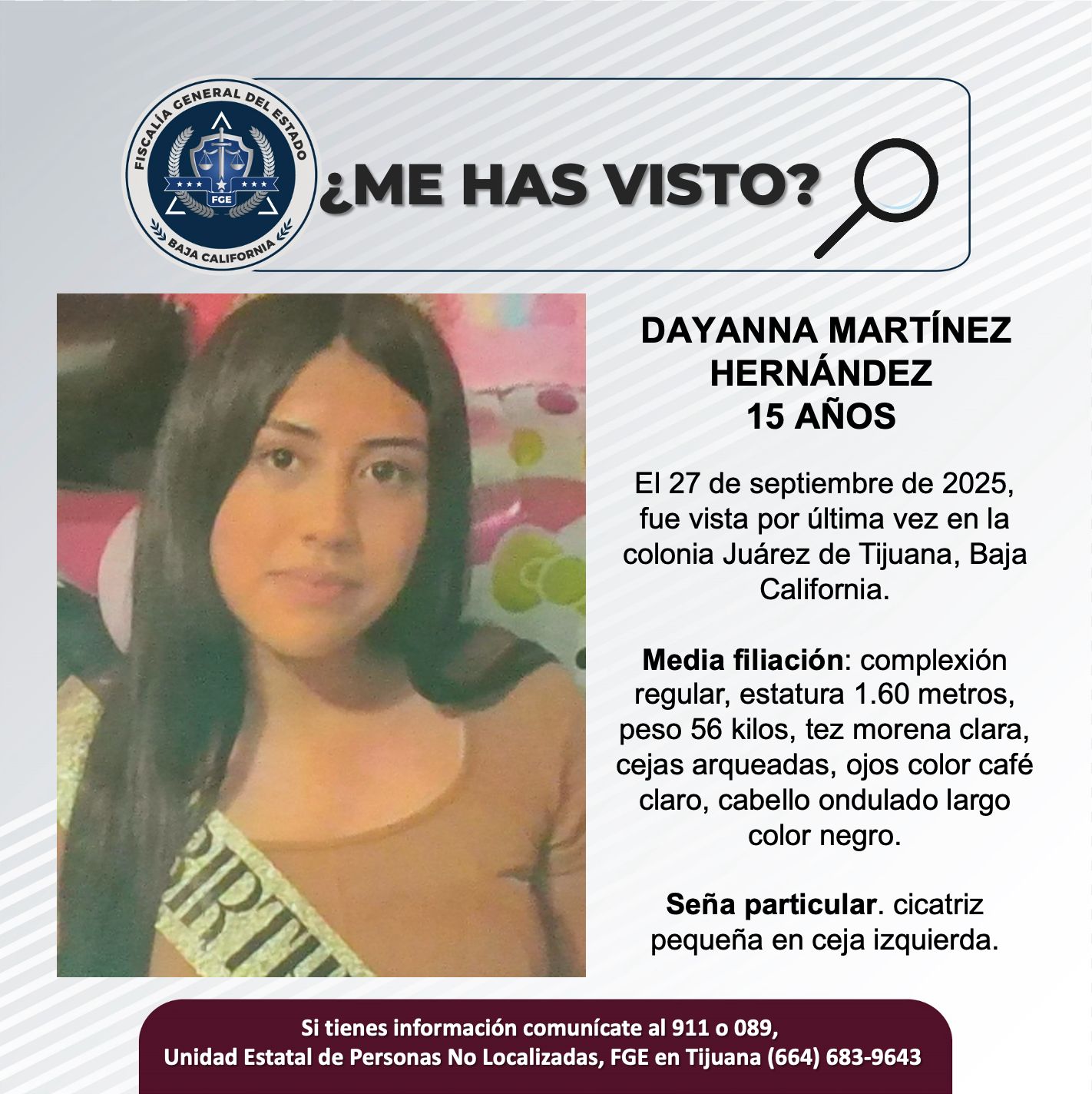 TIJUANA, Baja California, 02 de octubre del 2025.- La Fiscalía General del Estado (FGE) solicita el apoyo de la ciudadanía para localizar a Dayanna Martínez Hernández de 15 años de edad.